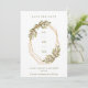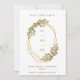 An elegant rustic wedding save the date announcement featuring a faux gold glitter geometric frame with watercolor black olives and green leaves. Personalise with your details in green font and add your photo to the reverse.