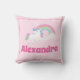 This cute and magical custom pillow features a soft pink background framed with a think pink border. A pastel colored faux glitter rainbow appears in the center with a matching unicorn placed in front of it. A sample name is printed below in a whimsical pink font that you can personalize to include your own child's name.