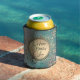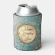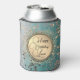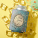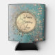 On this elegant can cooler are glittery whimsical stardust on an ombre blue teal backdrop with an elegant gold circle with gold flourish where you can personalise your event creating dreamy glam vibes.