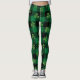 These leggings feature a vibrant and festive pattern combining classic plaid with sparkling shamrocks. The design consists of alternating green and black squares, some of which are filled with diagonal stripes, creating a dynamic and eye-catching background. Scattered across the plaid are glittering green shamrocks, adding a touch of sparkle and charm. This unique combination of traditional plaid and glittery shamrocks makes these leggings perfect for celebrating St. Patrick's Day or adding a bit of festive flair to any outfit.