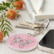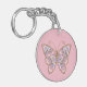 Pretty pink key chain, with graphics of a rose gold outlined pastel butterfly, on the front. The back of the key chain has a glittery rose gold dotted circle, with custom purple text ready to personalise. Lovely little gift idea for her.