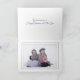 Elegant photo Christmas greeting card done in white, on the front with three light regency blue ornament baubles, with faux glitter. The inside bottom has a space to personalise with your photograph and the top has custom text greeting you can personalise to read what you want.