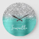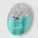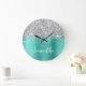 Glittery Silver Turquoise Glam White Script Name Large Clock