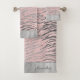 On this elegant towel set is silver glittery shaded zebra print on a pink blush back round for contrast with a silver shimmery trim adorned with a silver pearly necklace for extra glam. On the large towel you can personalised it on the silver border with a name, letter or logo. Trendy zebra chic theme.