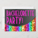 Invitation with a modern design featuring stars scattered over a stylised "sequin look" rainbow-coloured striped curved shape and 'Bachelorette Party!' in shades of pink on a black background. Can be used as a background for your own text, images and ideas. The text can easily be changed using the template provided or click the 'Customise It' button to make further alterations. Please note this is a printed digital art image, it does not shine or contain real glitter or sequins.