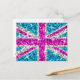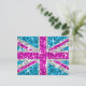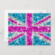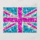 Fly the UK flag with a twst! A fun Union Jack design featuring stars scattered over a stylised "sequin look" pattern background. Postcard with a pink, white, silver grey and blue customisable design for you to personalise with your own text, pictures and ideas. Please note this is a printed digital art image. The product does not shine or contain real glitter or sequins.