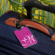 pink glitter custom luggage tag with leather strap: large script monogram and name