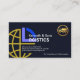 Cover features a global design with the letter-L at the left wall of the card. The letter-L forms the word "LOGISTICS" which you can change accordingly to suit your needs. Your business name is just above this followed by the contact details and a slogan caption near the base of the card. At the top right corner is a gold truck logo you can use.