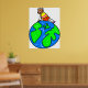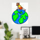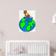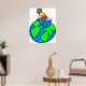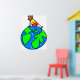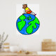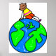Cute cartoon whimsical illustration of a happy little stick figure boy sitting on the world. Easily customise and choose your own background colour or add text. Image available on various gifts and products.