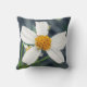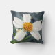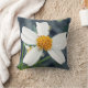 The image on this 16” Throw Pillow is an original photograph by MaeFlowers of a wildflower. It is a tiny white flower with five petals and a yellow orange pompom in the centre. The photo is a closeup, with the flower itself in sharp focus, the flower's green stem and leaves in soft focus, and the rest of the background in soft shades of dark bluish grey. The flower is a weed, filling the lawn with whiteness.