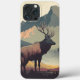 Beautiful nature scene featuring mountains and a bull elk in muted colours.