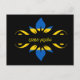 Blue and Yellow scrollwork on black postcard with Slava Ukraini in Cyrillic lettering. Cyrillic is the alphabet used in the great country of Ukraine.