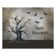 A spooky tree stands against the backdrop of a huge moon. A black raven sits in its branches and several bats fly in the air. The “Happy Halloween” can be changed or deleted if desired.