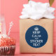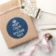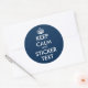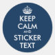 Navy blue and white glossy round stickers | Keep calm and your text. Customisable Keepcalm template with custom background colour and text. Vintage Keepcalmandcarryon theme. Create your own keep calm and carry on parody. Dark red and white typography with crown. Funny for party favours or as envelope seals. Use for wedding, Birthday, baby shower, christmas and more occessions. Make your own cute sealers.