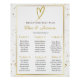 Guide your guests to their seats in style with this beautiful white and gold wedding table plan. Designed with sophistication in mind, the table plan features a clean white background complemented by luxurious gold accents, offering a refined and timeless look. The elegant gold lettering highlights each table name or number, ensuring clarity and ease of use, while the delicate details add a touch of glamour to your reception decor. Perfect for couples looking to create a seamless, stylish experience, this table plan enhances your wedding’s atmosphere with its blend of classic charm and modern elegance.