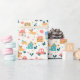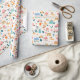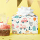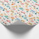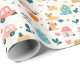 Wrapping paper with a playful pattern of cartoon-style animals and objects, such houses, cars, and dogs, all arranged in an abstract manner, on a bright background, suitable for babies and children's wrapping paper. The design is simple yet cute, with bright colours that appeal to kids, in pastel colours, with a message, "Be joyful everyday"