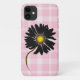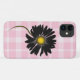 Black daisy with glowing yellow centre on white and pink plaid background.