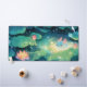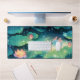 Illuminate your desk with this magical, whimsical illustration featuring a tiny, cheerful blue axolotl with adorable pink-tipped gills. The little creature is comfortably settled in a spot of glowing yellow light on a dark, deep blue pond. The scene captures a rainy night, with glistening raindrops streaking down and splashing across the surface of immense luminous green lily pads. Beautiful pink and orange lotus flowers float alongside the axolotl, enhancing the dreamy aquatic night theme. This enchanting design brings a unique, serene, and fantastical atmosphere to any workspace. This desk mat offers versatile use for various other businesses, events, or situations.