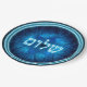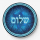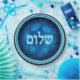 An elegant design featuring glowing blue and white Hebrew text reading, "Shalom" (שלום - peace) superimposed on a blue, etched-look fractal image of a Star of David.