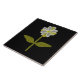 This awesome tile features a digital image of a daisy with a green stem with two green leaves on it and white and yellow coloured petals with a yellow centre. The petals look like they are glowing with a beautiful reflective quality. The flower is on a black background for maximum contrast and the result is stunning.