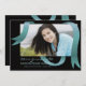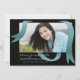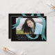 A modern invitation featuring a teal blue ribbon loosely hanging over your favourite photo with a black background.