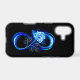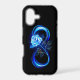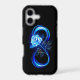 Luminous infinity symbol with glowing, beautiful, lushly blooming rose made of blue flames on black background.