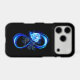 Luminous infinity symbol with glowing, beautiful, lushly blooming rose made of blue flames on black background.
