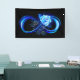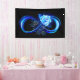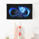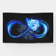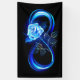 Luminous infinity symbol with glowing, beautiful, lushly blooming rose made of blue flames on black background.