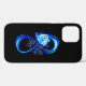 Luminous infinity symbol with glowing, beautiful, lushly blooming rose made of blue flames on black background.