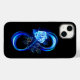 Luminous infinity symbol with glowing, beautiful, lushly blooming rose made of blue flames on black background.