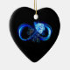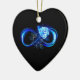 Luminous infinity symbol with glowing, beautiful, lushly blooming rose made of blue flames on black background.