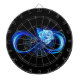 Luminous infinity symbol with glowing, beautiful, lushly blooming rose made of blue flames on black background.