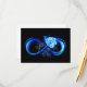Luminous infinity symbol with glowing, beautiful, lushly blooming rose made of blue flames on black background.
