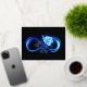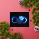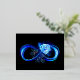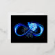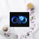 Luminous infinity symbol with glowing, beautiful, lushly blooming rose made of blue flames on black background.