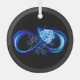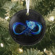 Luminous infinity symbol with glowing, beautiful, lushly blooming rose made of blue flames on black background.