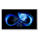 Luminous infinity symbol with glowing, beautiful, lushly blooming rose made of blue flames on black background.