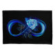 Luminous infinity symbol with glowing, beautiful, lushly blooming rose made of blue flames on black background.