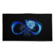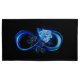 Luminous infinity symbol with glowing, beautiful, lushly blooming rose made of blue flames on black background.