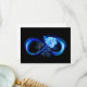 Luminous infinity symbol with glowing, beautiful, lushly blooming rose made of blue flames on black background.