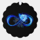 Luminous infinity symbol with glowing, beautiful, lushly blooming rose made of blue flames on black background.