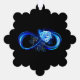 Luminous infinity symbol with glowing, beautiful, lushly blooming rose made of blue flames on black background.