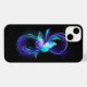 Infinity symbol with magical, purple glowing butterfly with transparent wings, on black background. Glowing butterfly.