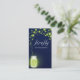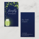 A glowing jar of lime green fireflies on a dark blue night sky with speckled stars background. An elegant and nostalgic design that reminds of summertime when the lightning bugs glow and light up the warm summer nights. Custom vertical business information template fields for you to make it your own, including name, title, and contact information. The back has a simple matching blue background with white text.