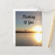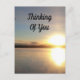 Send a "Thinking Of You" message on a postcard with the glowing light of the sun casting shining over the smooth water on a calm lake. The bold design is modern and simple with grey, black and gold colours sending a warm and supportive sentiment.