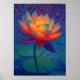 Colorful pointillist painting of a radiant lotus flower rising above calm water. Thousands of vibrant dots create a luminous neo-impressionist floral composition filled with peaceful light and delicate color.