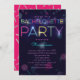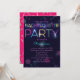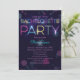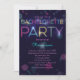 Bachelorette party invitation in dark purple with glowing neon letters and bokeh.