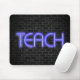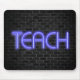 Glowing purple neon TEACH marquee sign on urban brick wall.