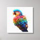 This is a vibrant, glowing parrot with a mesmerising mix of colours. Its feathers are a blend of deep blues, fiery reds, bright oranges, and lush greens, creating a radiant, almost magical effect. The bird's beak is a soft, natural shade, contrasting beautifully with its luminous plumage. Small glowing particles and sparks surround the parrot, giving it an ethereal, fantasy-like aura. The overall aesthetic is a fusion of realism and digital artistry, making it look like a creature from an enchanted, futuristic jungle.