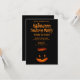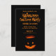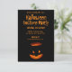 Orange and black Halloween party invitation with glowing pumpkin image.