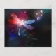 Glowing, flying, red dragonfly, with transparent, detailed wings on dark, nocturnal, luminous background with tropical plants and fireflies. Red dragonfly.